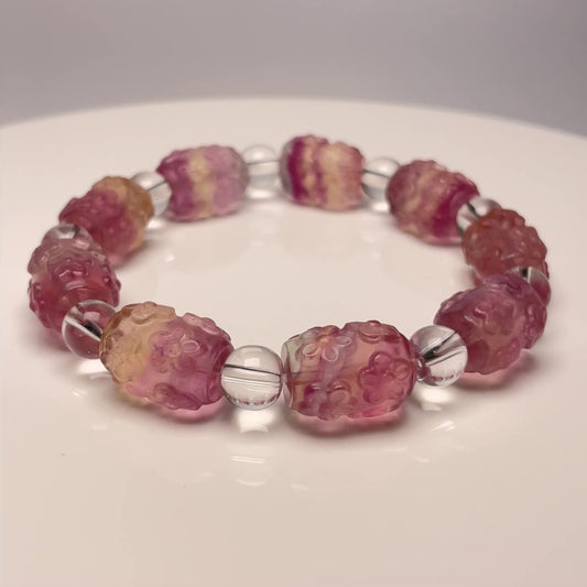 Stonelry Natural Multiple Colors Carved Flowers Fluorite Beaded Bracelet (11x14.2 - 12.3x16.1mm)