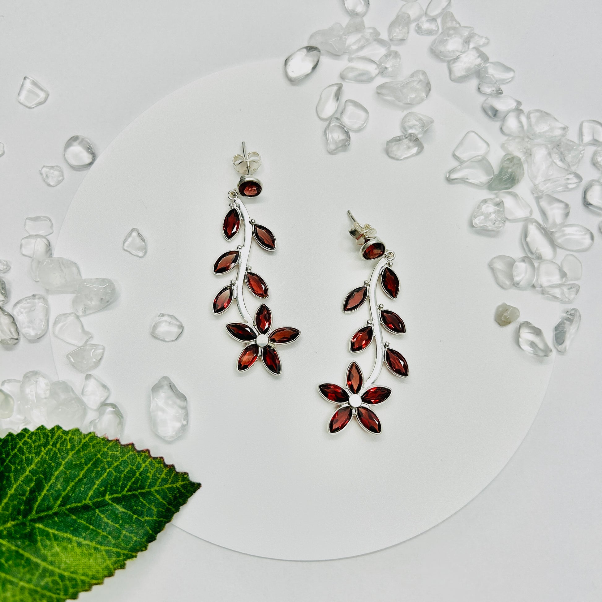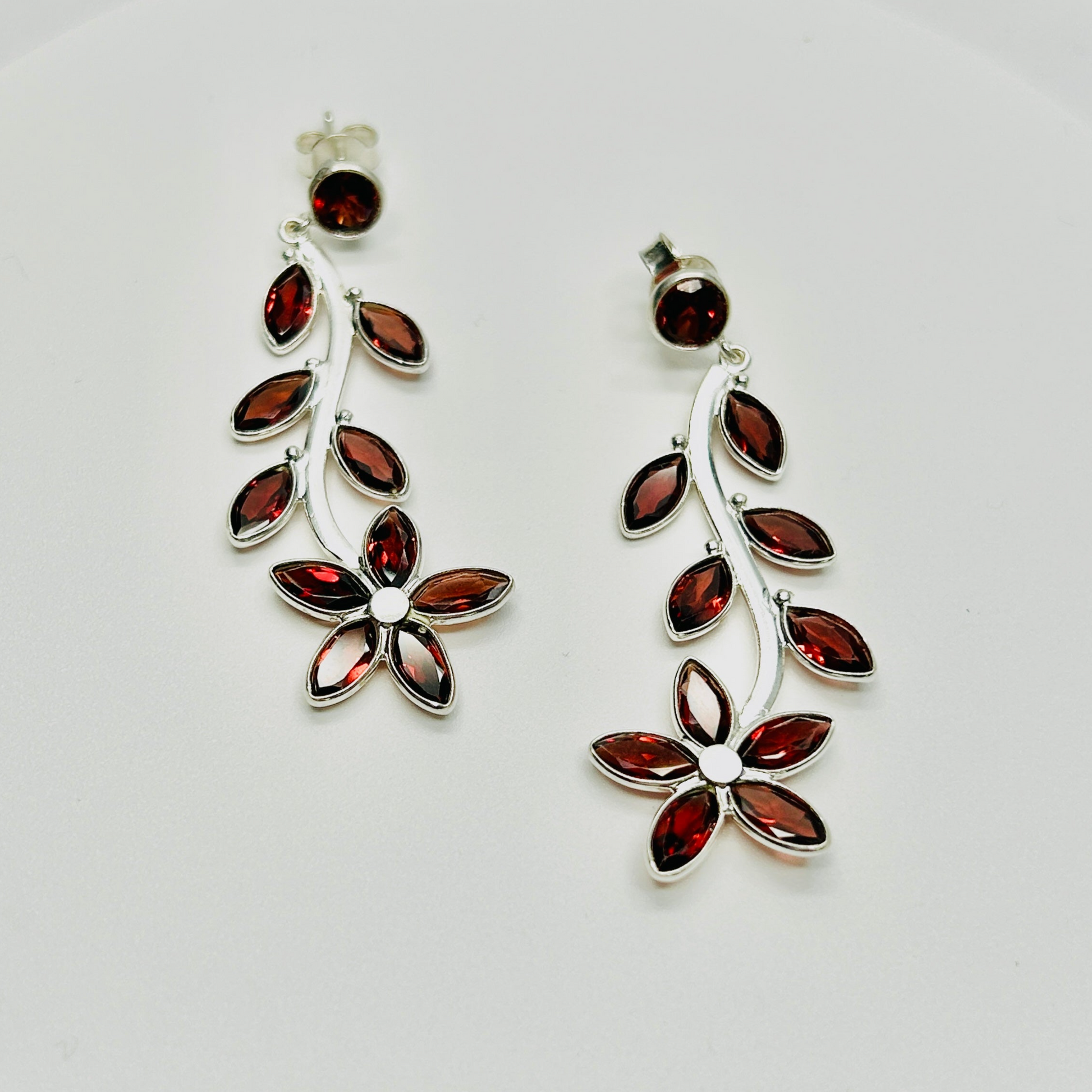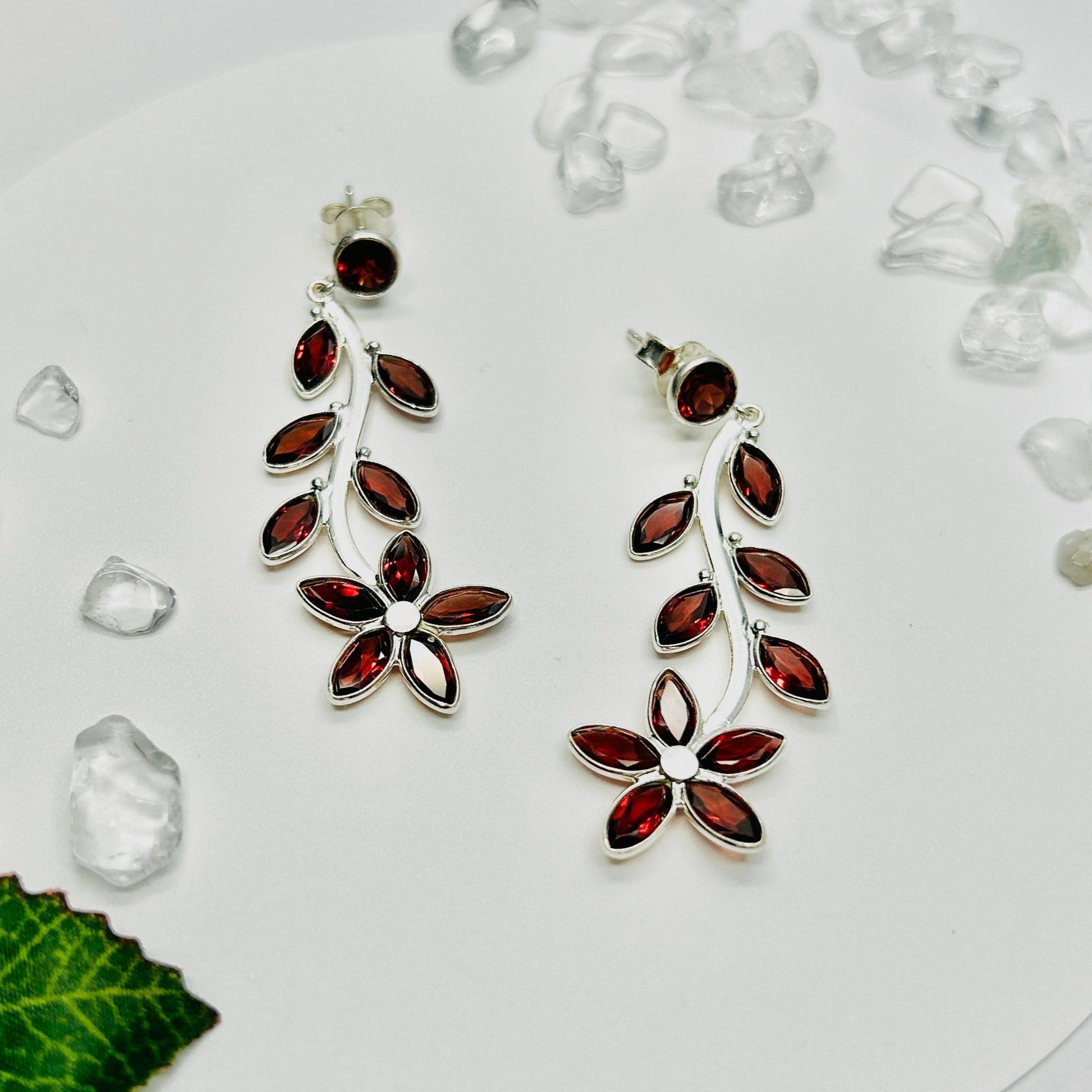 Ignite Your Style with our Blooming Flame Stud Dangle Earrings. Embrace fiery elegance with these captivating earrings, which feature a delicate stud adorned with vibrant red garnet leaves, that gracefully transitions into a dangling flower embellished with sparkling red garnet and silver.