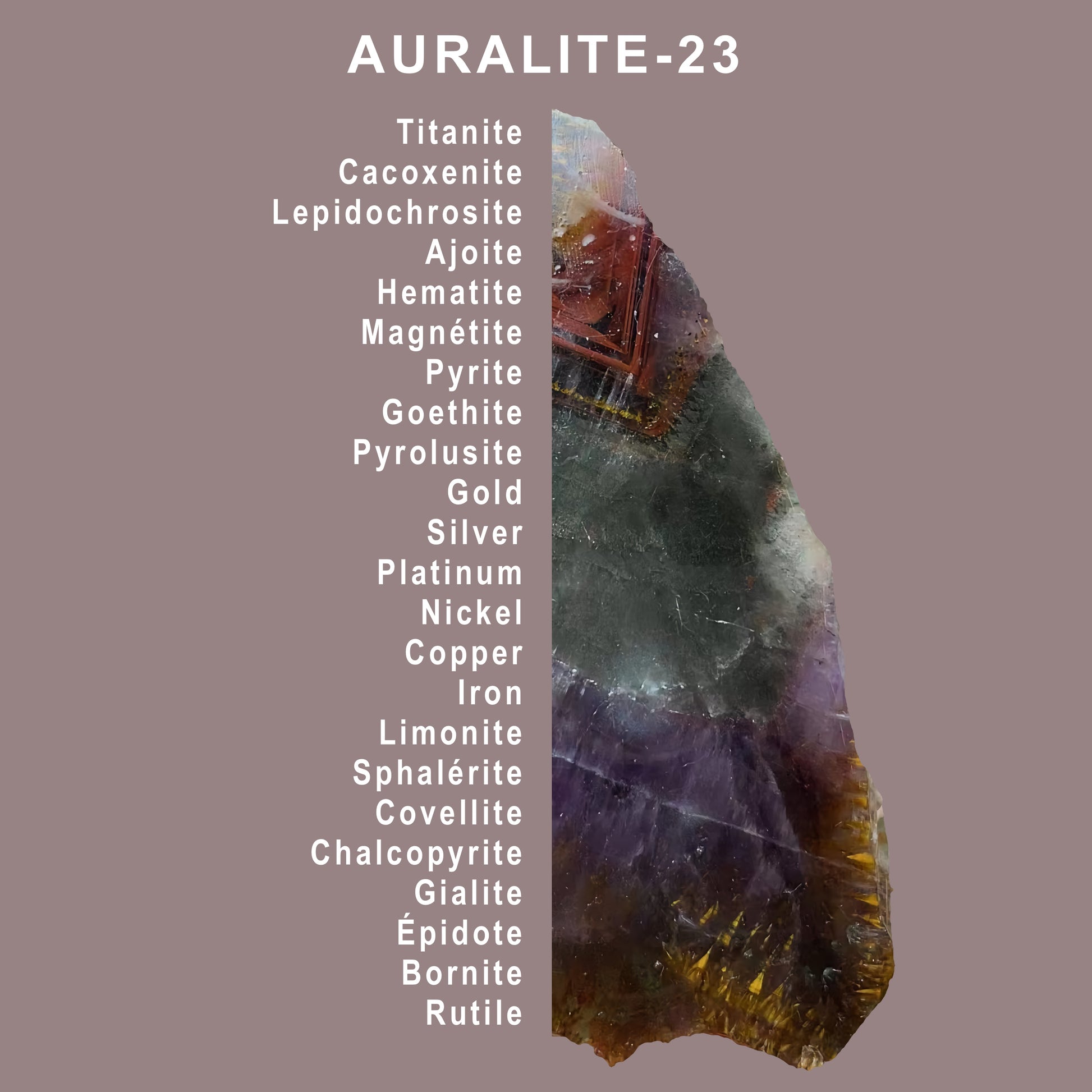 Auralite 23 crystal is a very rare type of amethyst that also well-known as Red Cap Amethyst. Auralite 23 was discovered in Canada in 2007 and formed more than a billion years ago. An auralite 23 crystal often contains a combination of about 2 to 7 different minerals from a list of 23, as its name indicates.