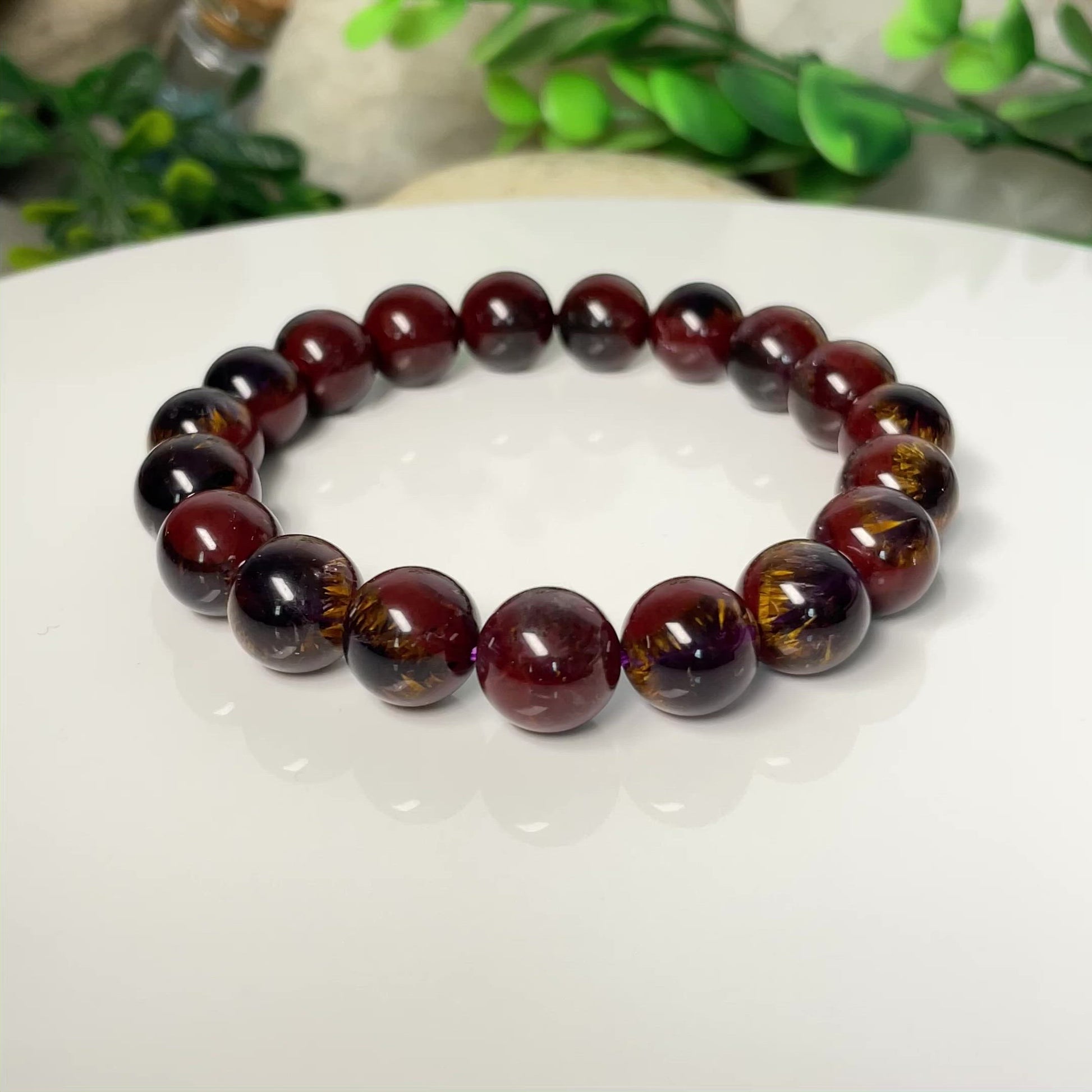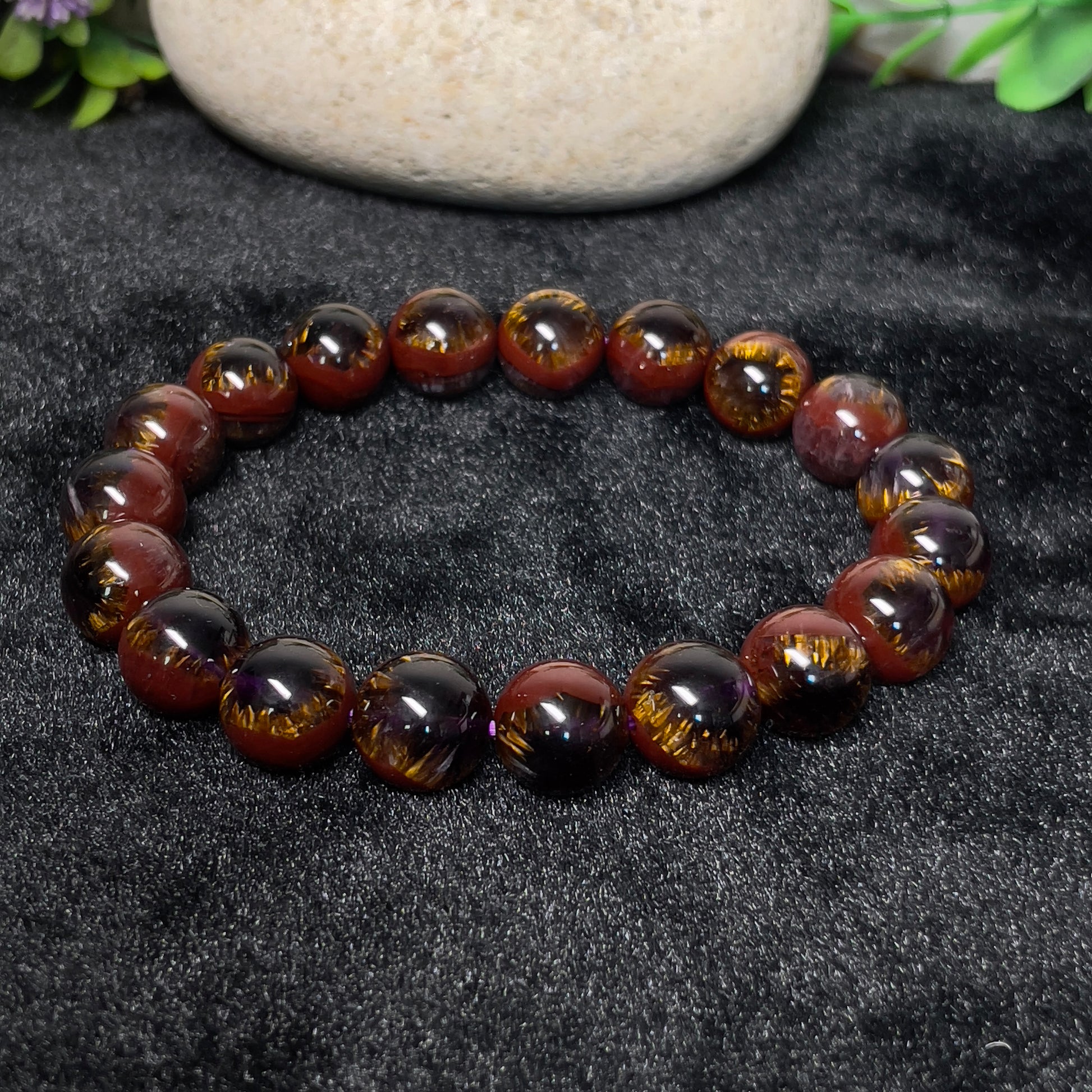 A rare sky eye auralite 23 crystal beaded bracelet contains sky eye in each bead. Auralite 23 crystal is a very rare type of amethyst that also well-known as Red Cap Amethyst. Auralite 23 was discovered in Canada in 2007 and formed more than a billion years ago. An auralite 23 crystal often contains a combination of about 2 to 7 different minerals from a list of 23, as its name indicates.