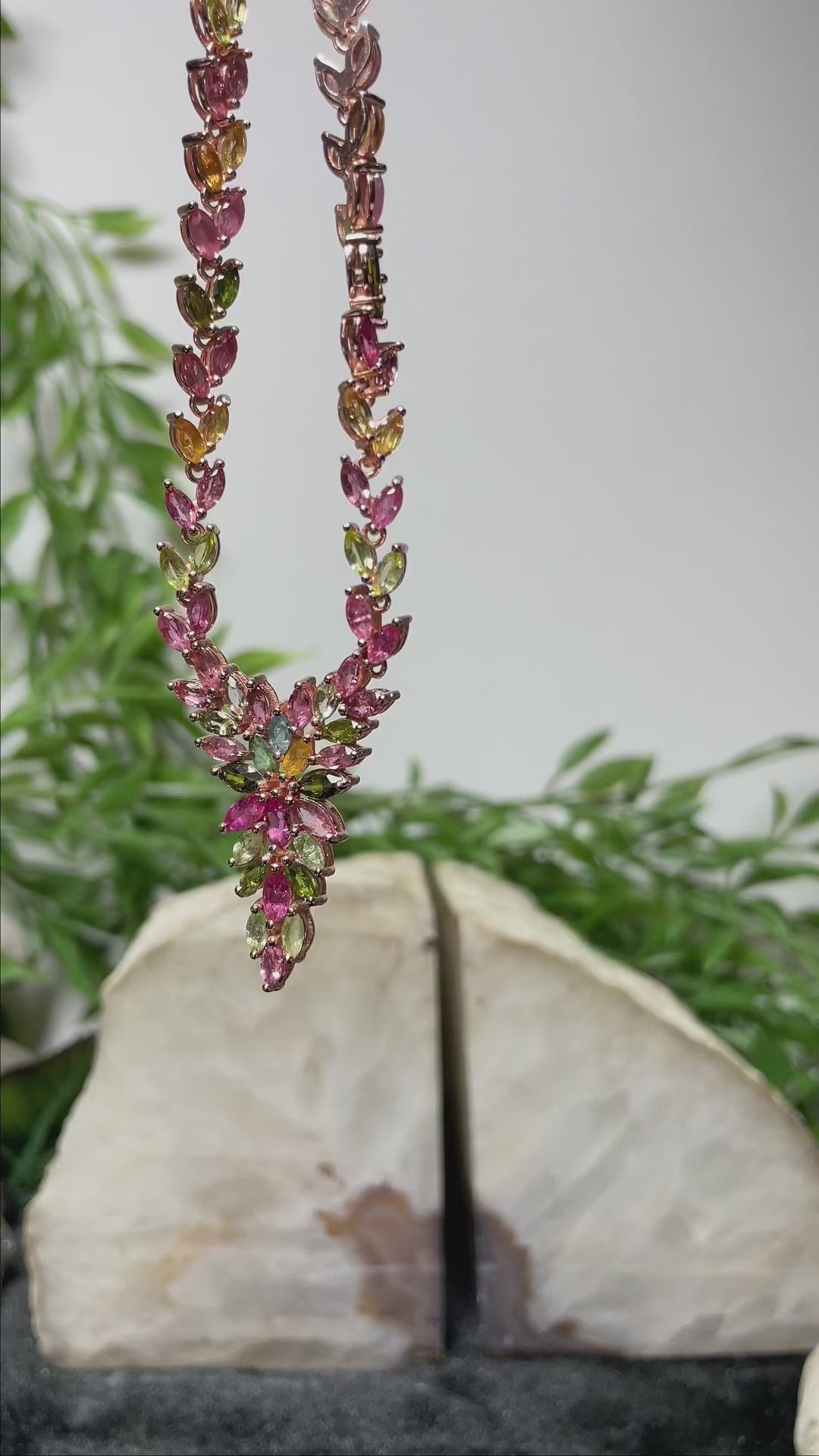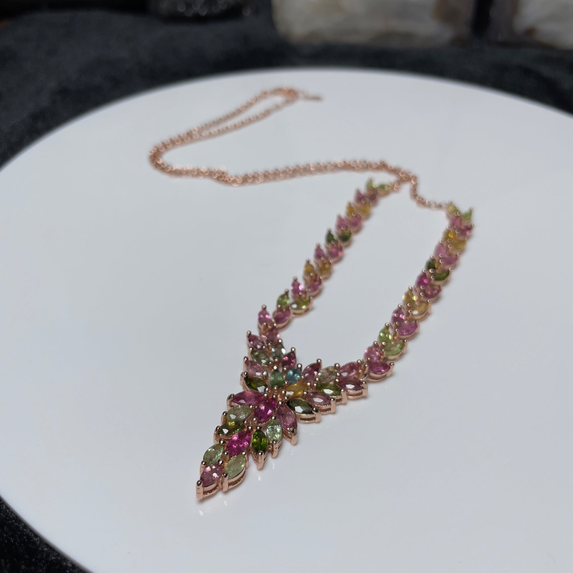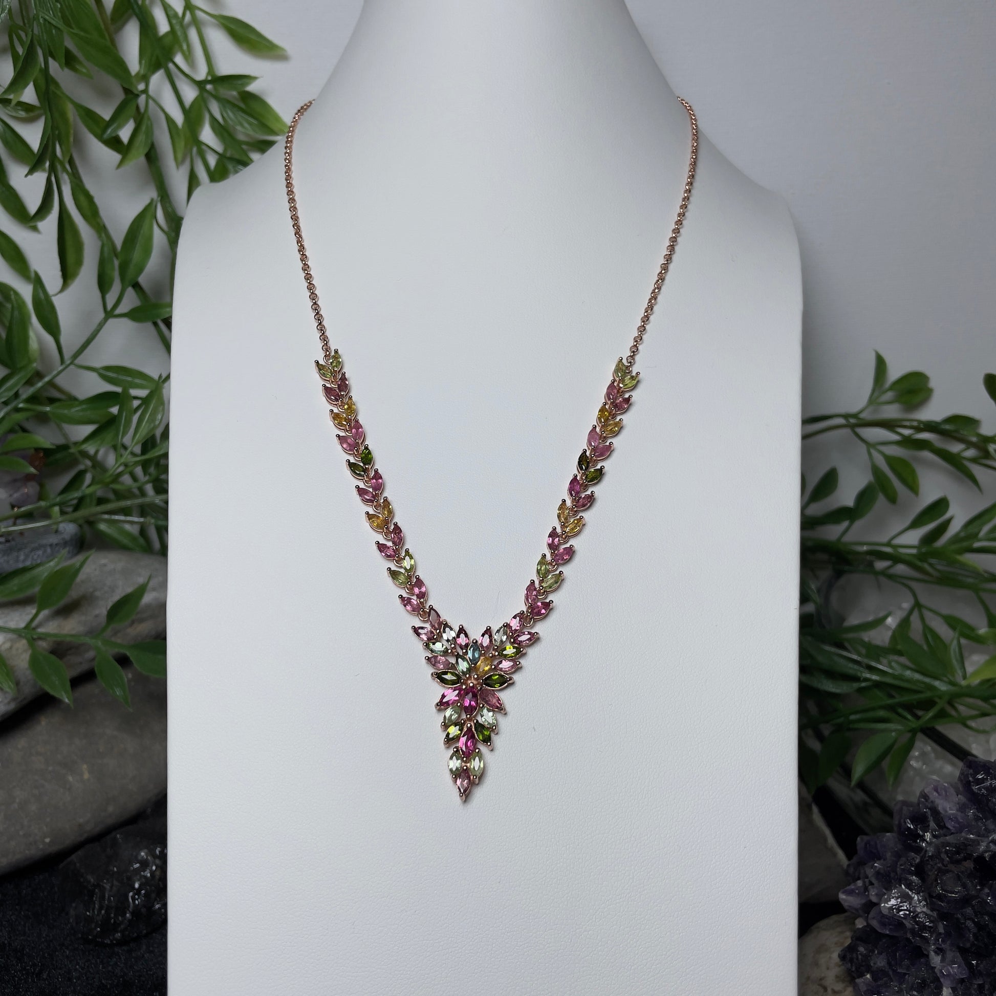 Each tourmaline is expertly set in a durable rose gold plated S925 sterling silver chain, ensuring that the necklace sits gracefully at the collarbone. The pendant’s design, featuring an array of leaf-like structures, adds a touch of organic elegance to your ensemble, making it an ideal accessory for both formal events and everyday sophistication.