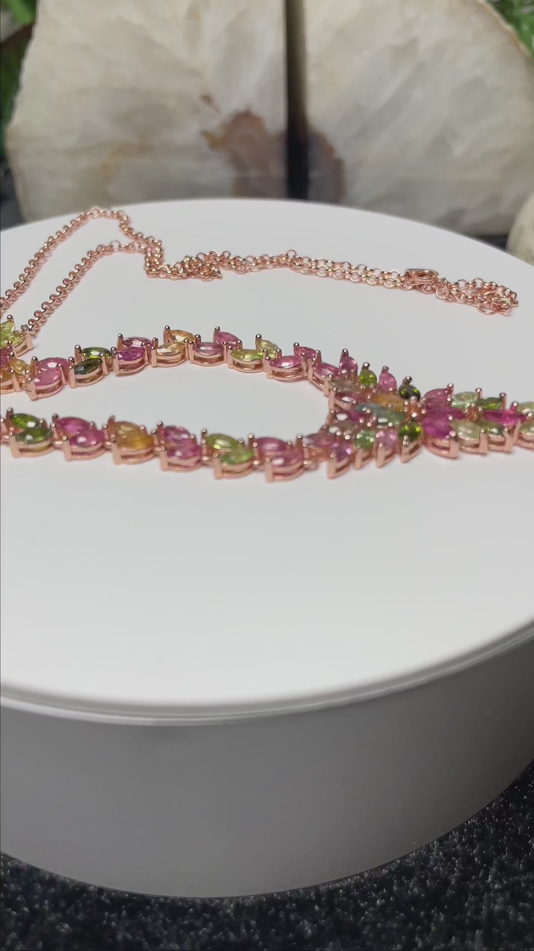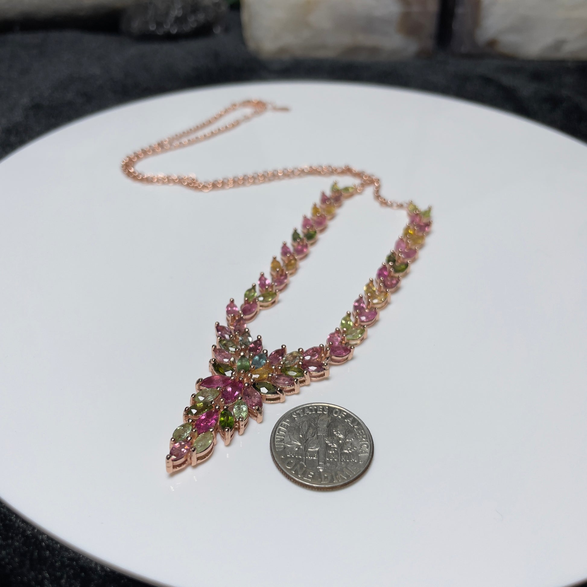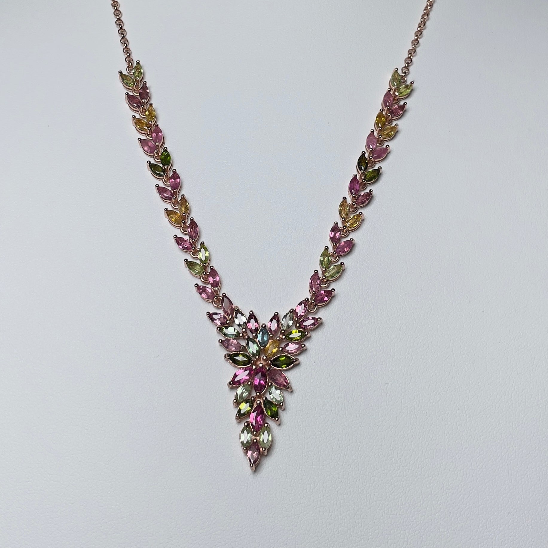 Each tourmaline is expertly set in a durable rose gold plated S925 sterling silver chain, ensuring that the necklace sits gracefully at the collarbone. The pendant’s design, featuring an array of leaf-like structures, adds a touch of organic elegance to your ensemble, making it an ideal accessory for both formal events and everyday sophistication.