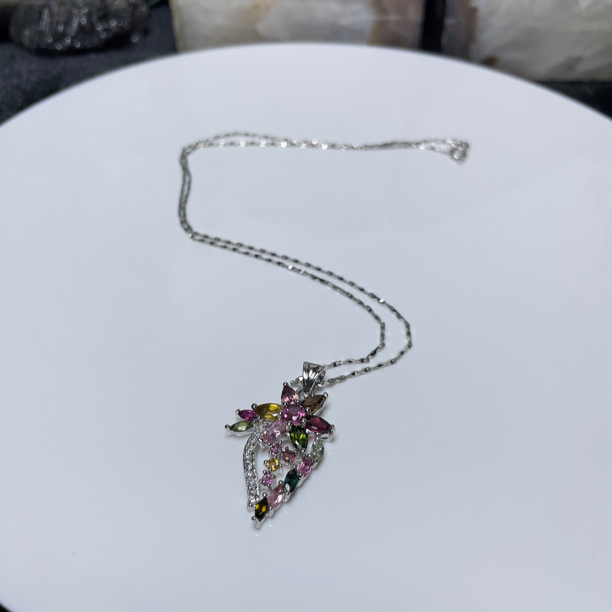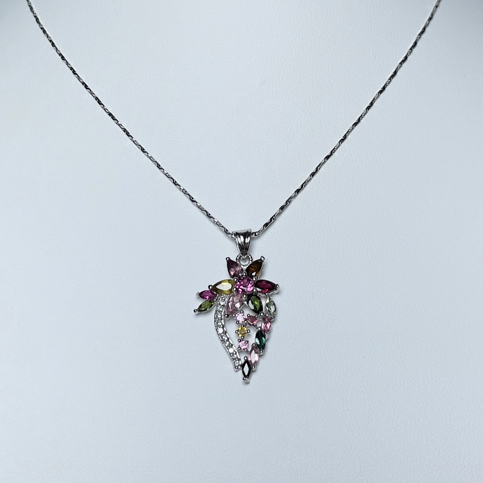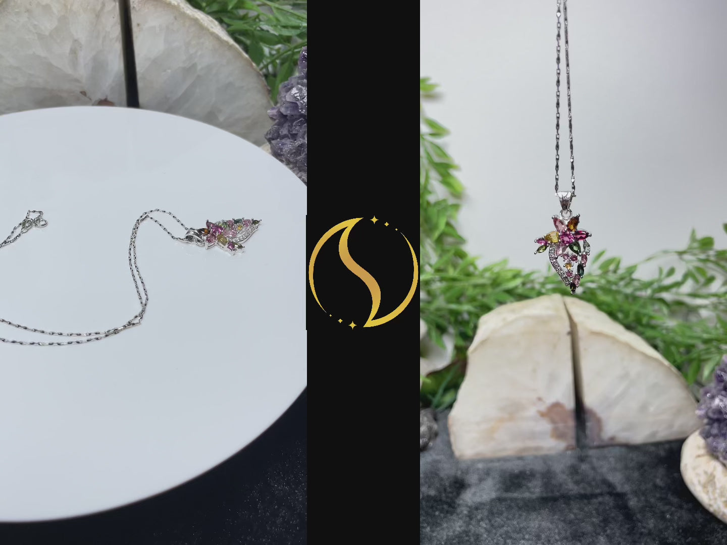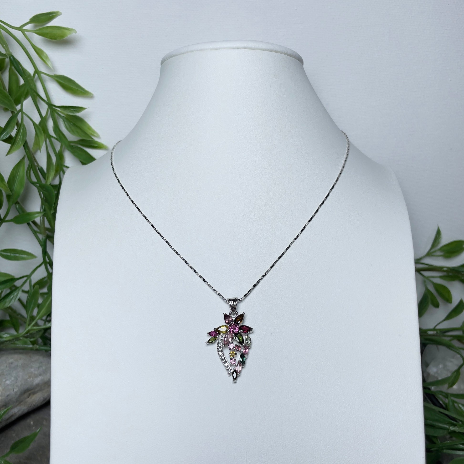 Unveil the splendor of our meticulously crafted Tourmaline and Zircon Flower Pendant, a dazzling addition to any jewelry collection. This pendant features a bouquet of radiant tourmaline petals in varying shades of pink and green, symbolizing compassion and vitality. At the heart lies a vibrant cluster of zircon stones, sparkling with the brilliance of diamonds to capture and reflect light from every angle.