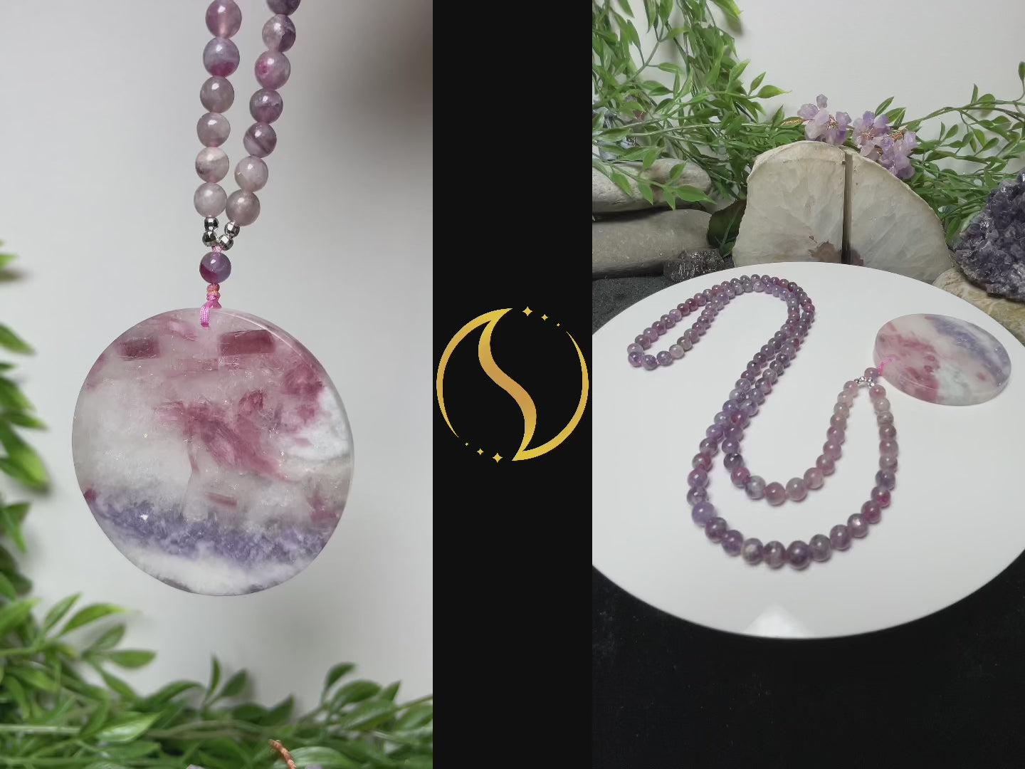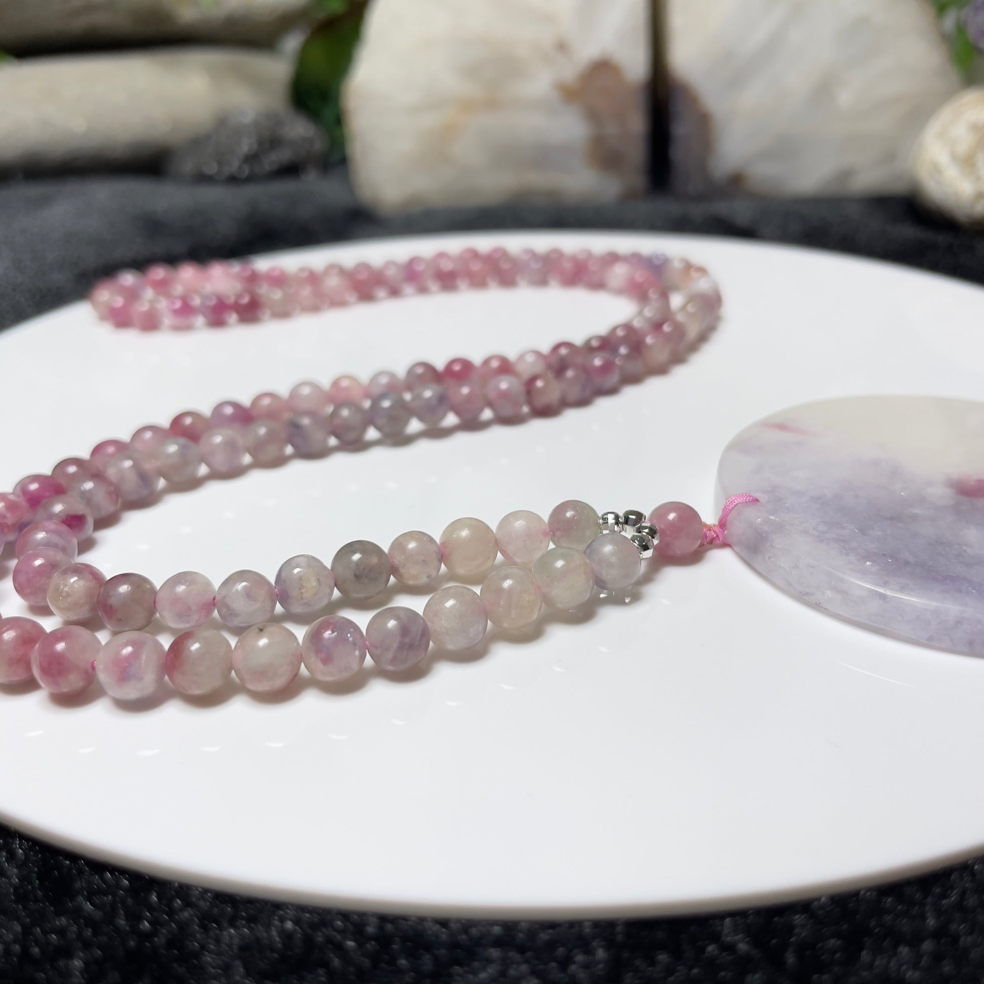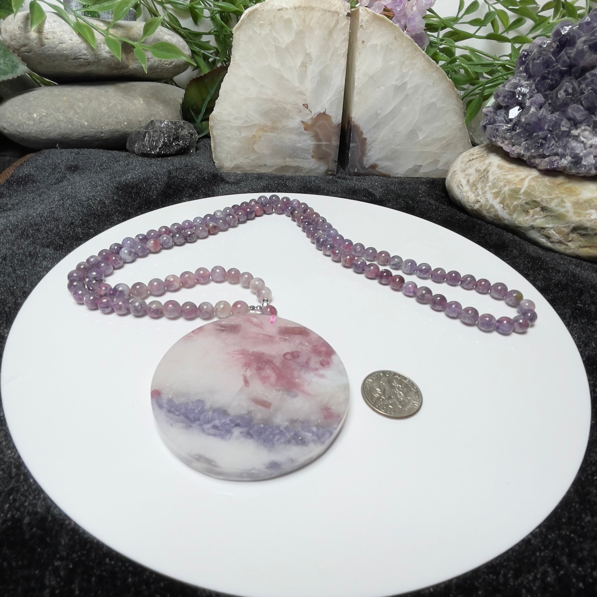 Add a touch of sophistication to your ensemble with this exquisite Pink Tourmaline Beaded Necklace, featuring a stunning, large circular pendant. Handcrafted with care, this necklace showcases a strand of delicately cut pink tourmaline beads that exude a soft, feminine charm. At its center, a beautifully polished circular tourmaline pendant hangs gracefully, its unique pattern of hues ranging from pale to deep pink, with natural purple accents creating a mesmerizing effect. Each tourmaline piece is thought to bring its own healing properties, promoting a sense of calm and well-being to the wearer. The necklace is secured with a robust and stylish clasp, ensuring a comfortable fit for any occasion. Whether you're dressing up for a special event or adding a splash of color to your everyday look, this Tourmaline pendant necklace is sure to captivate and enchant.