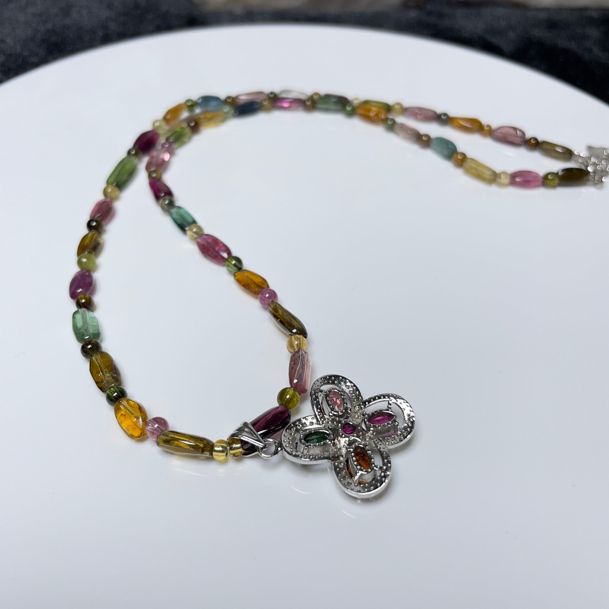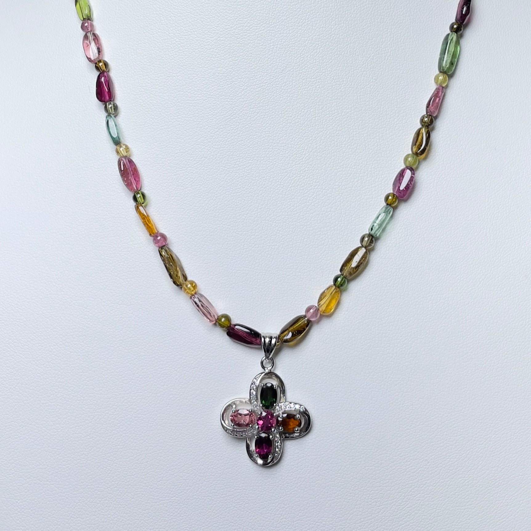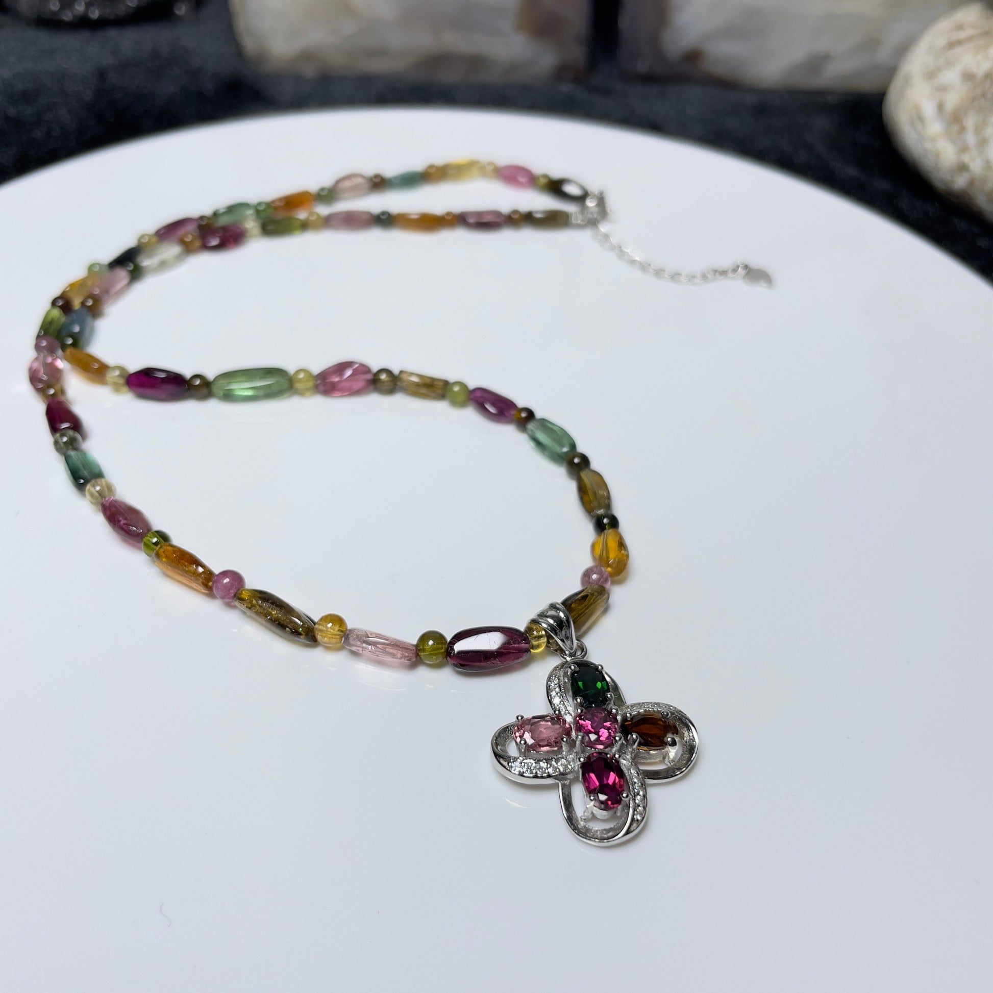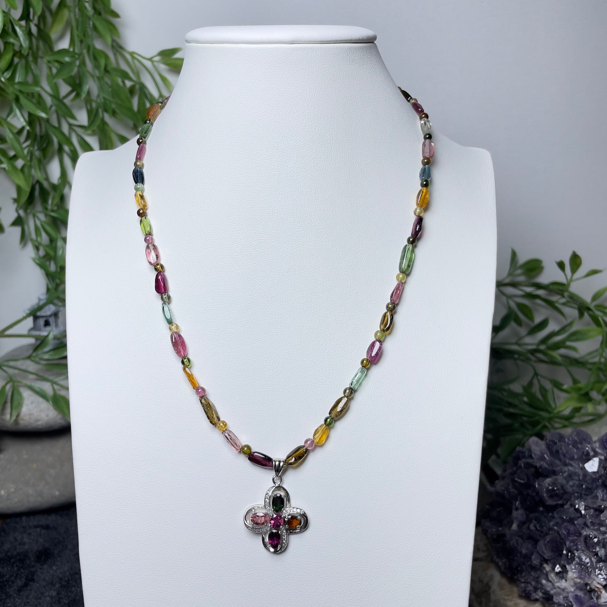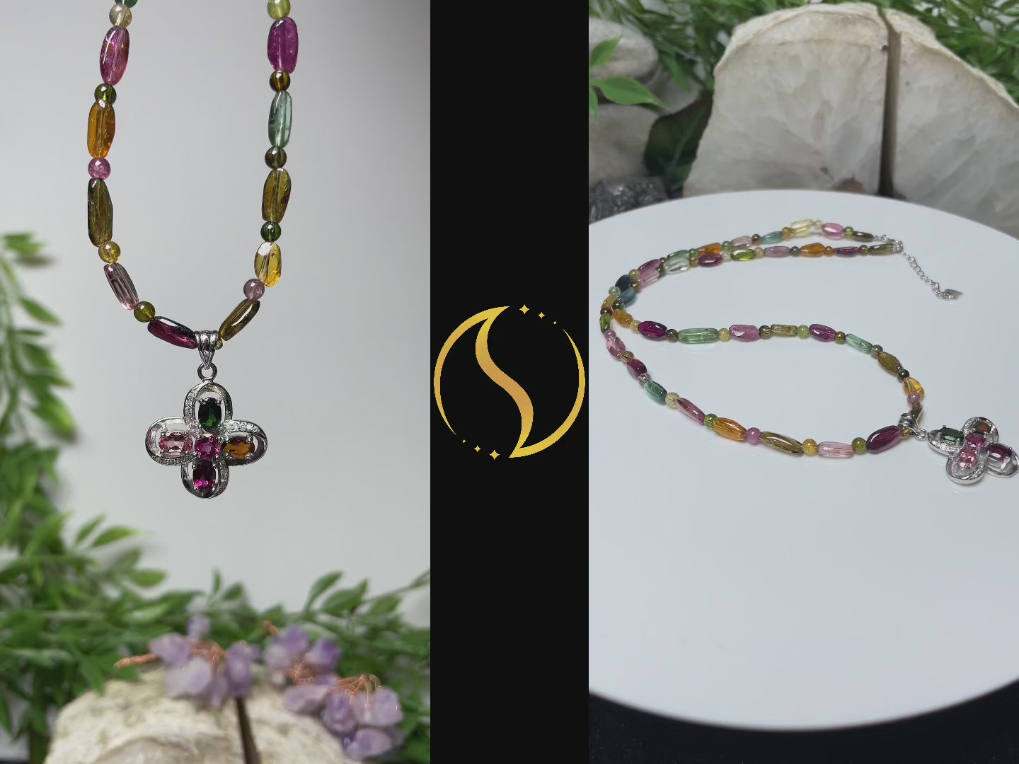 Add a touch of elegance and color to your wardrobe with this exquisite Multicolor Tourmaline Beaded Pendant Necklace. Each bead is carefully selected to create a harmonious flow of the natural hues of tourmaline, ranging from vibrant pinks to earthy greens and golden yellows. At the center of this colorful cascade hangs a beautifully crafted silver cross charm, adorned with a subtle arrangement of tourmaline inlays that echo the necklace's palette.