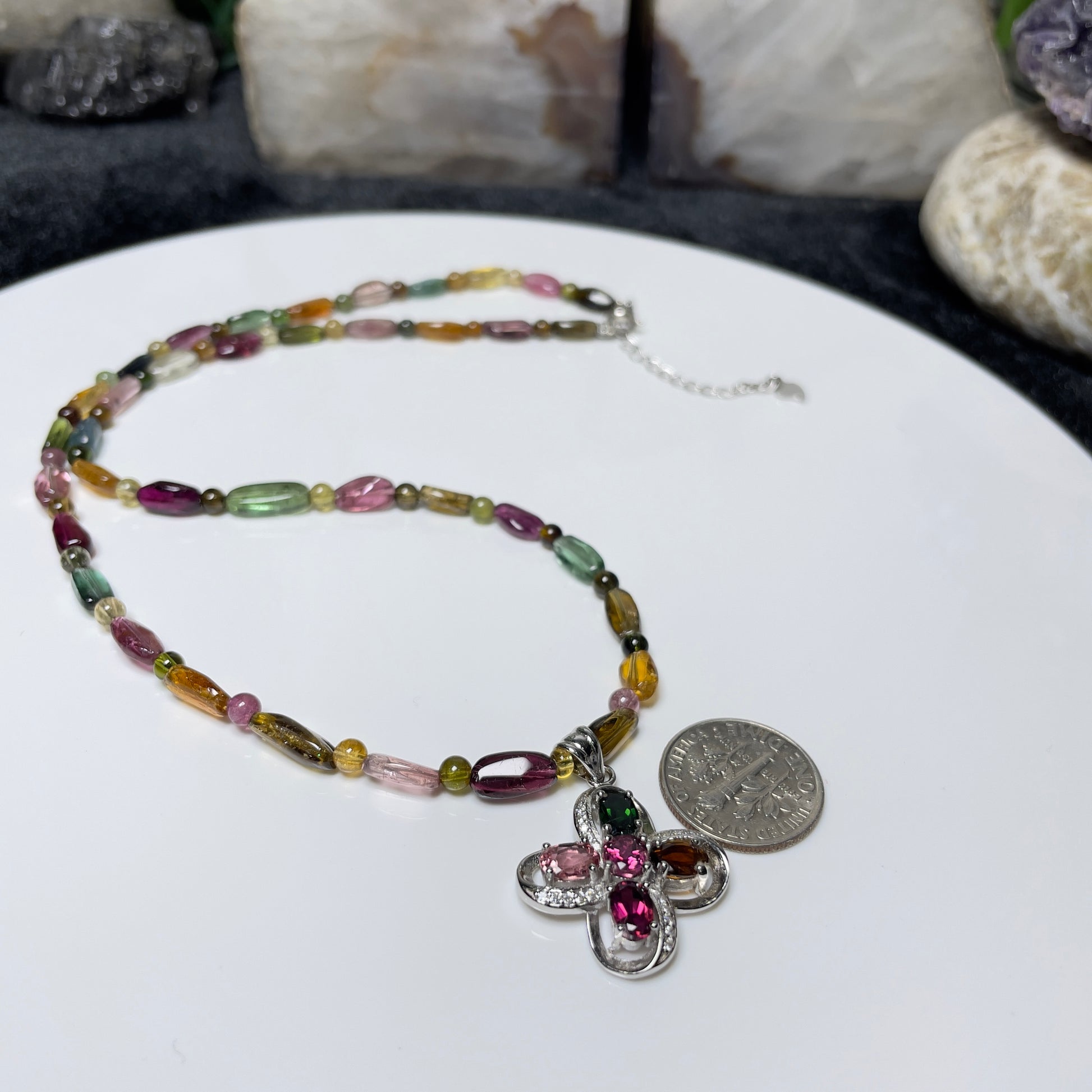 Embrace the rich spectrum of tourmaline and the serene beauty of this pendant necklace, a piece that promises to be a treasured addition to any collection.