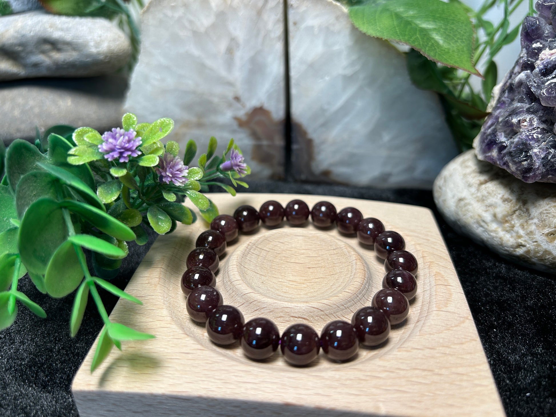 Add a touch of elegance and passion to your style with our garnet beaded bracelet. This stunning piece of gemstone jewelry features genuine garnet beads that are handcrafted into a stretchy design for easy wearing. The fiery red hues of garnet are expertly faceted to create a mesmerizing play of colors that catch the eye. This versatile bracelet can be worn on its own or stacked with other accessories for a stylish layered look. It's perfect for both everyday wear and special occasions.