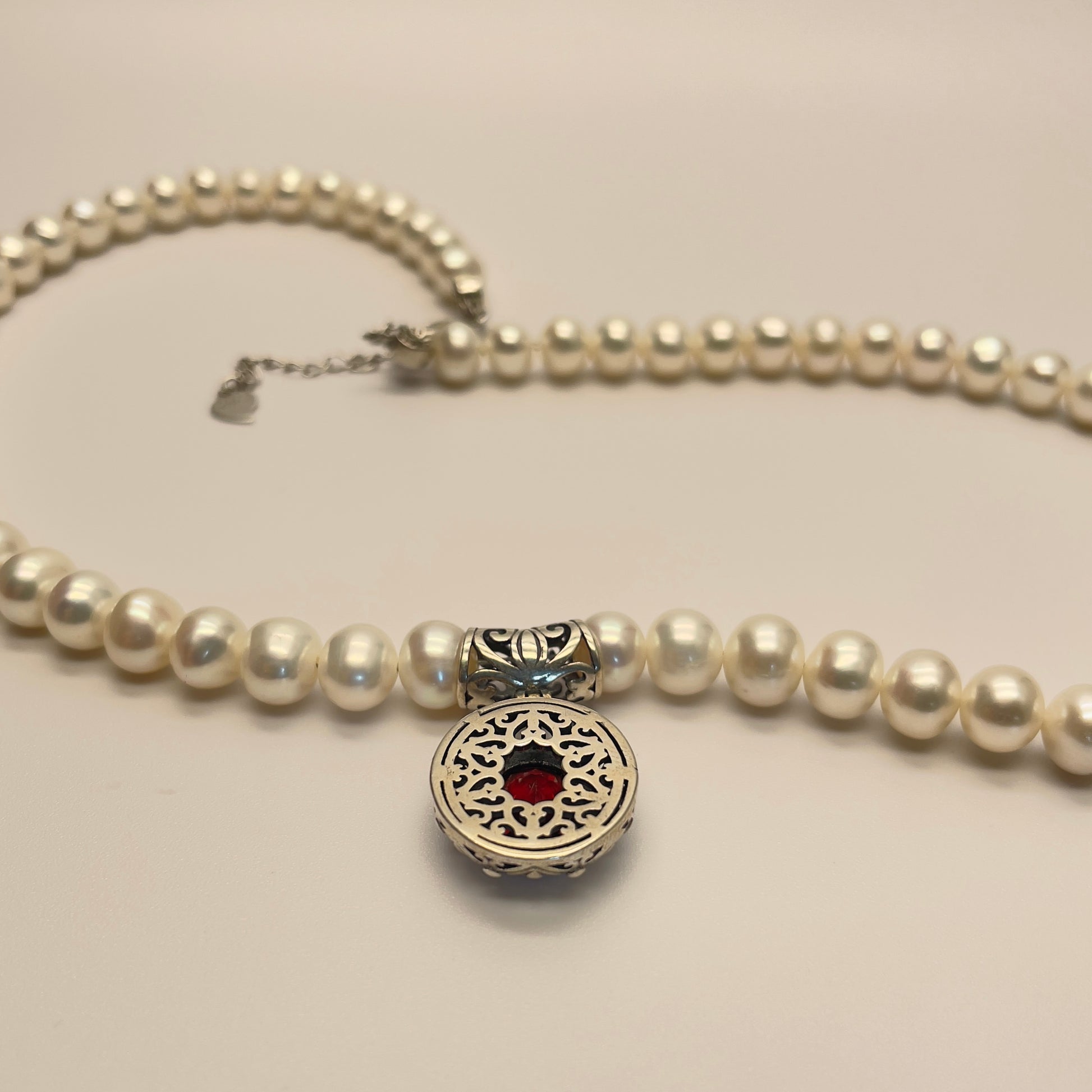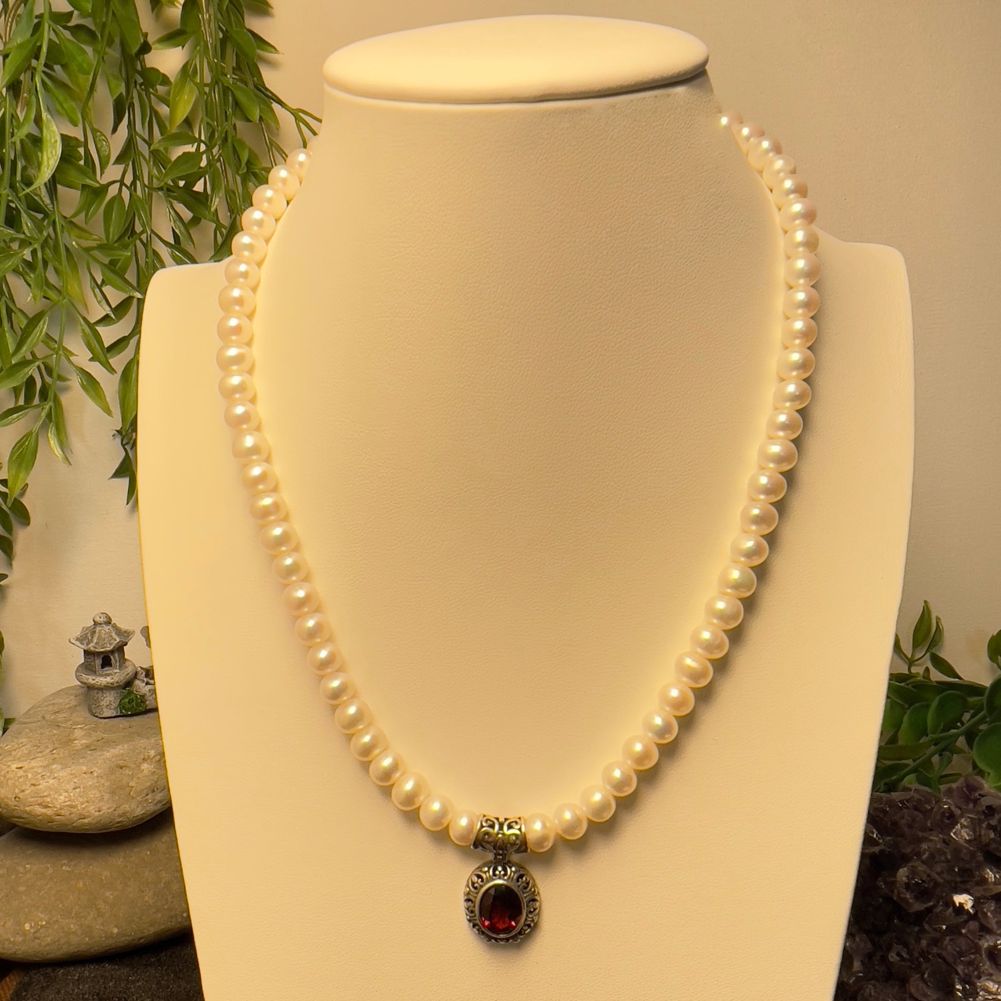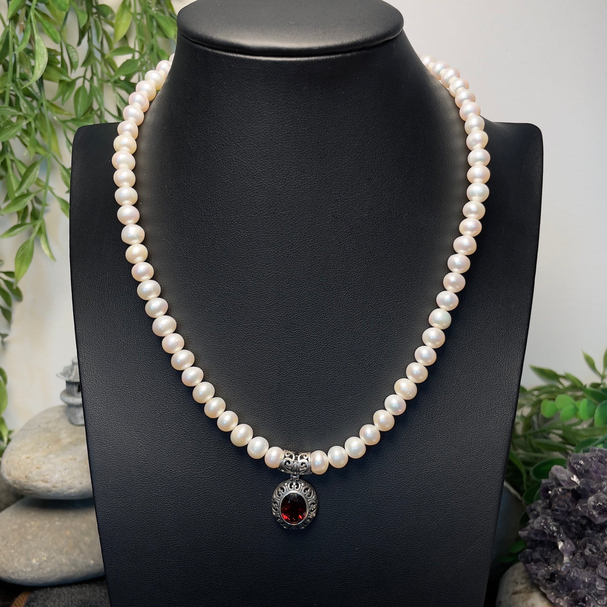 Introducing our stunning garnet pendant pearl necklace, a beautiful piece of gemstone jewelry that adds a touch of elegance and sophistication to any outfit. Handcrafted with attention to detail, this necklace features a faceted garnet gemstone that is expertly set in a sterling silver frame, surrounded by lustrous freshwater pearls.