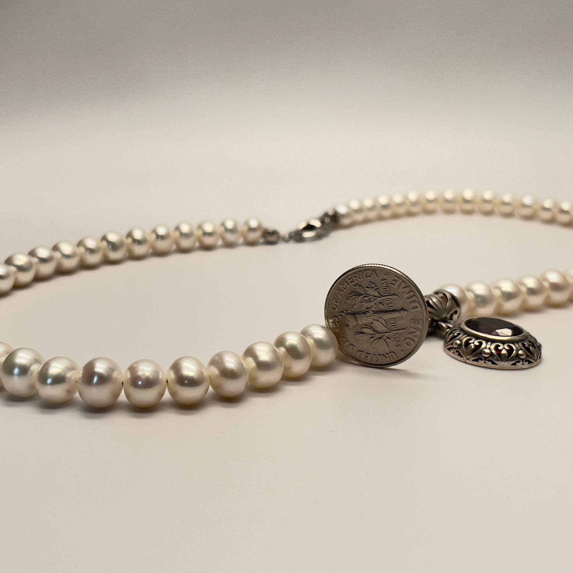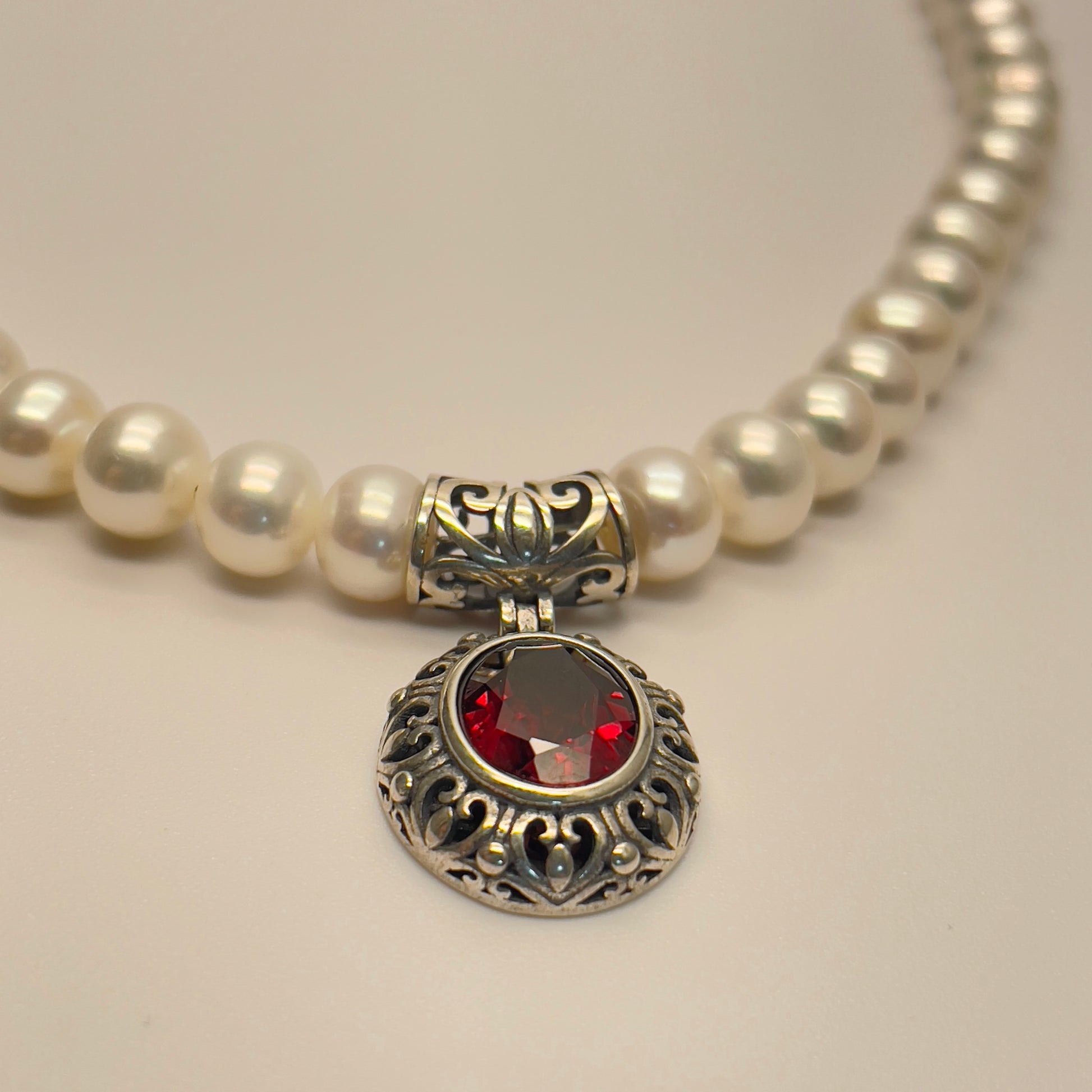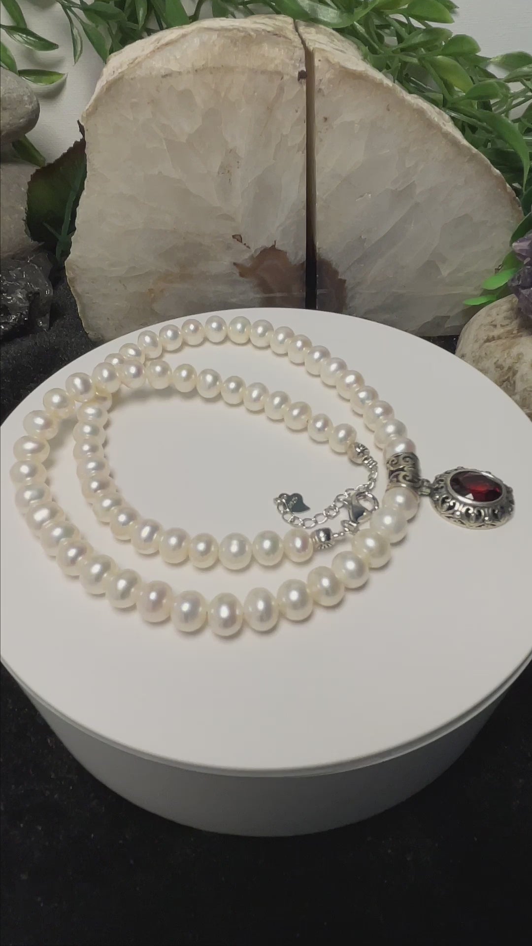 Introducing our stunning garnet pendant pearl necklace, a beautiful piece of gemstone jewelry that adds a touch of elegance and sophistication to any outfit. Handcrafted with attention to detail, this necklace features a faceted garnet gemstone that is expertly set in a sterling silver frame, surrounded by lustrous freshwater pearls.