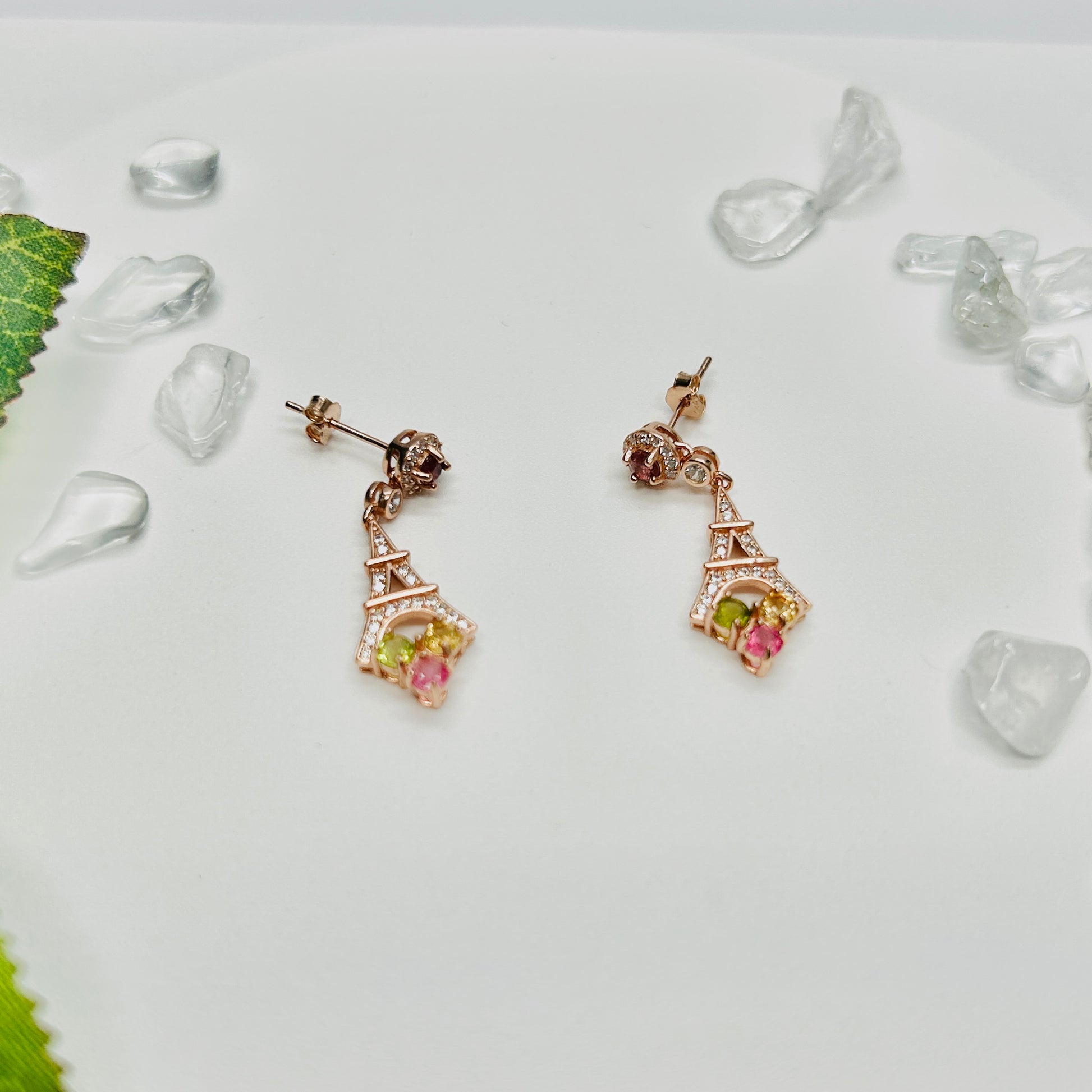 Capture Parisian twilight with our Eiffel Tower Sunset stud drop tourmaline earrings. These captivating earrings feature a two-part design that combines the iconic Eiffel Tower silhouette with the breathtaking hues of a Parisian dusk. Where Romance Meets Cityscape, our delicate Eiffel Tower studs, crafted from rose gold-plated sterling silver, add a touch of Parisian flair to your look.